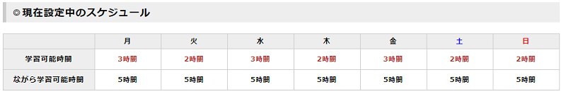 上図の様にそれぞれの曜日の時間帯に予定を入れていくと日々どれくらい学習すればよいかを教えてくれます。